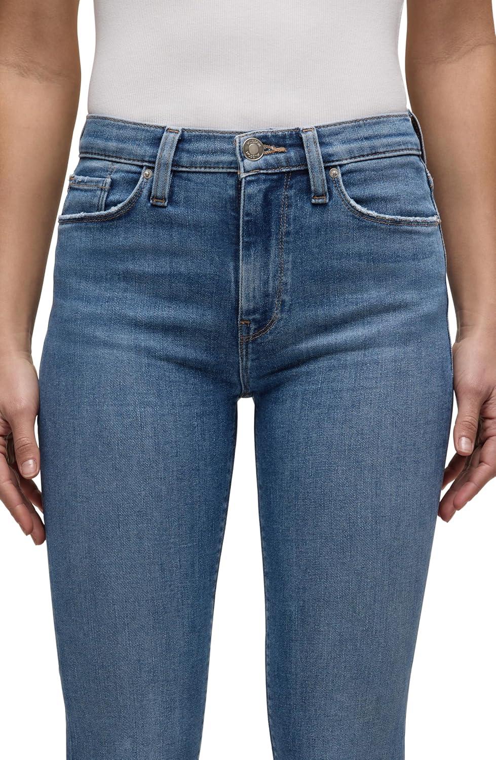 These petite high-rise jeans have a slim, contoured fit, gently flared leg, zipper fly, button closure, and belt-loop waistband. The 5-pocket construction adds function and style wherever you wear them. The high-rise waist measures 8 1/4″ and pairs with the fitted cut, 16-inch flared leg opening, and 31-inch inseam for a modern, flattering profile. Available in multiple washes and sizes, these pants offer an attractive design with unique detailing. Made from a high-quality blend of cotton and elastane for optimum stretch and comfort, these jeans are machine washable on a gentle cycle.