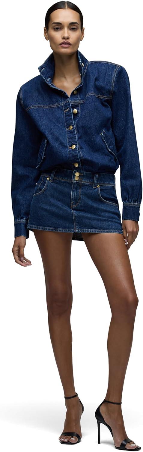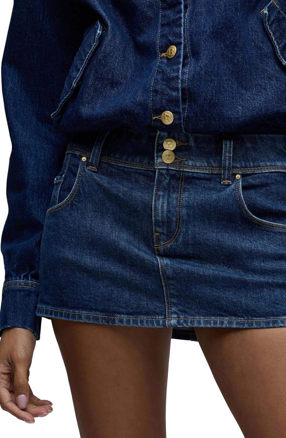 Part of our Brooks Nader collab capsule, the Micreaux Mini Skirt in Front Street is a nod to our roots, as this mini skirt features our original flap pockets with a double button at the waistband and our Union Jack flag label. To elevate the look, we added gold branded buttons and a branded leather patch to the back waistband. This skirt is made of a comfort stretch denim in a medium dark indigo wash with stone washing. It pairs great with the Beaucoup Bodysuit, or it can be worn by itself. This capsule was curated by model Brooks Nader and features her personal closet must-haves.