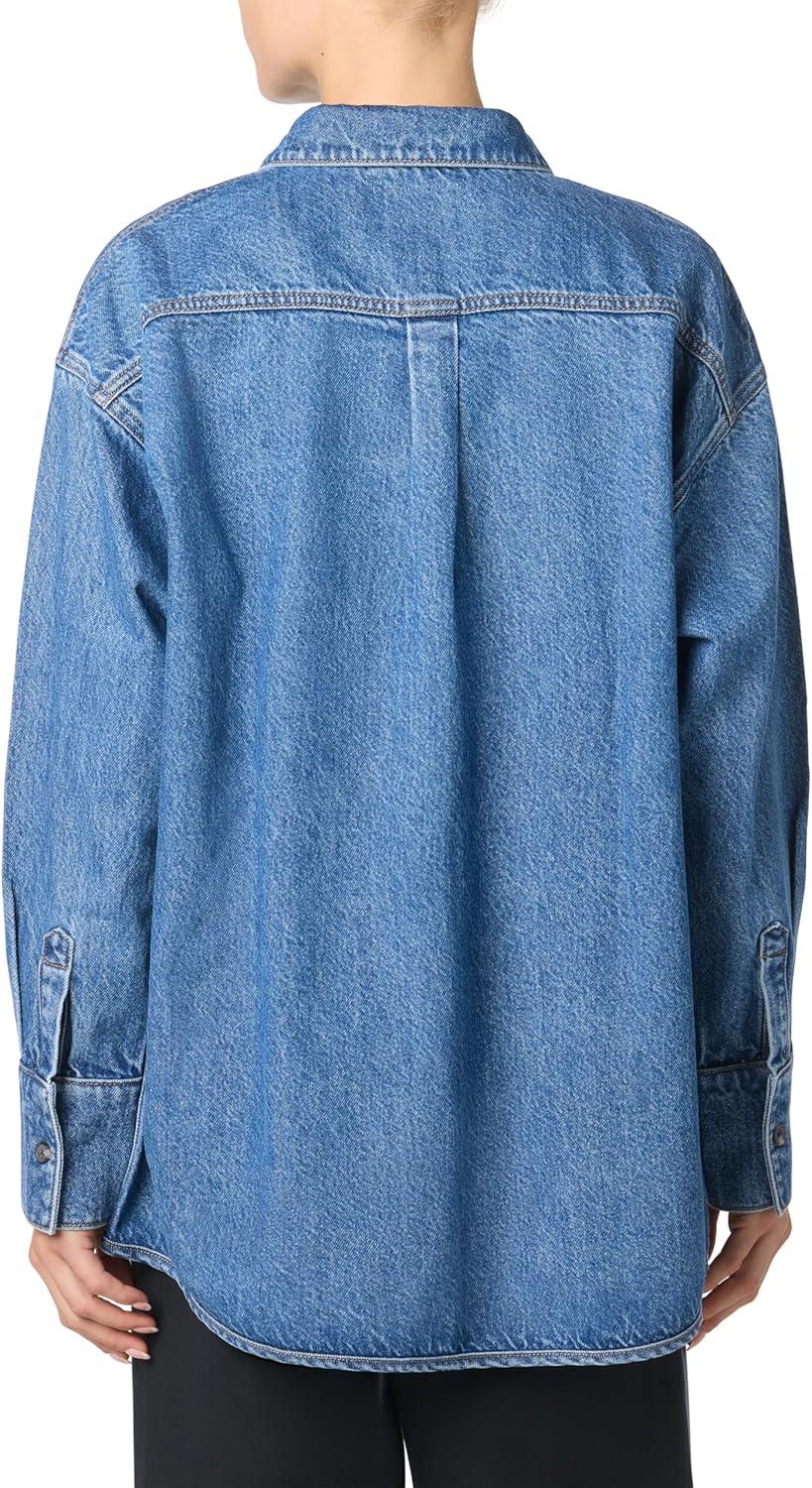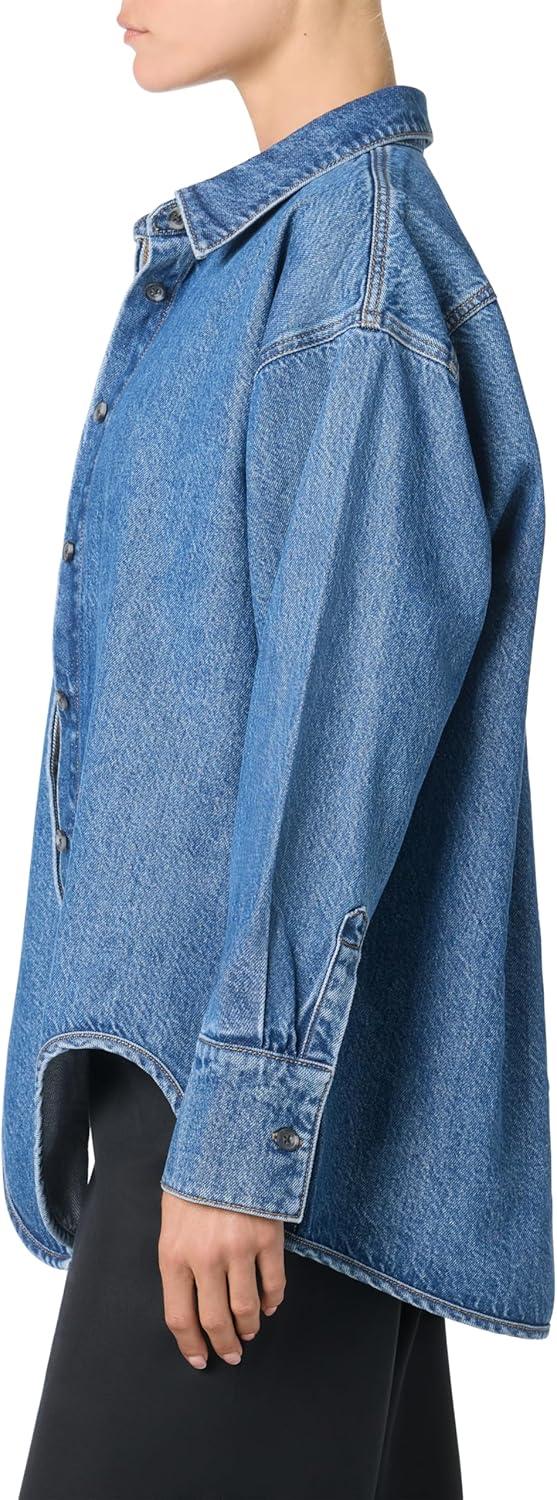 The Shacket in the light wash, Dubai, is cut from a lightweight, drapey rigid denim. The relaxed fit features long sleeves, pointed collar, side pockets and grinding along the edge.