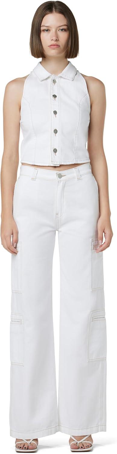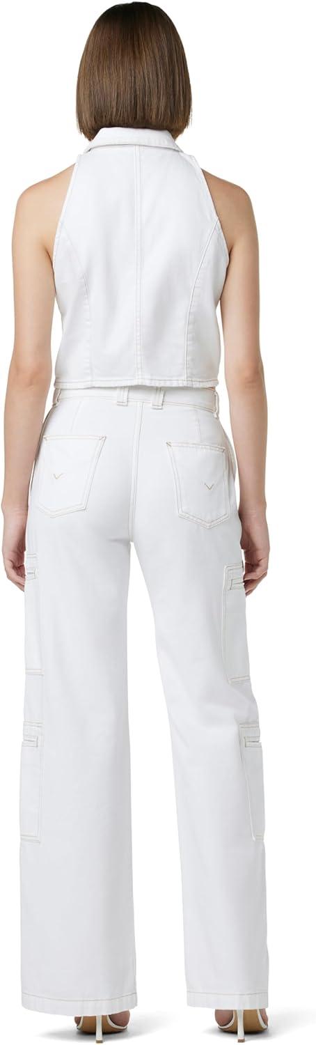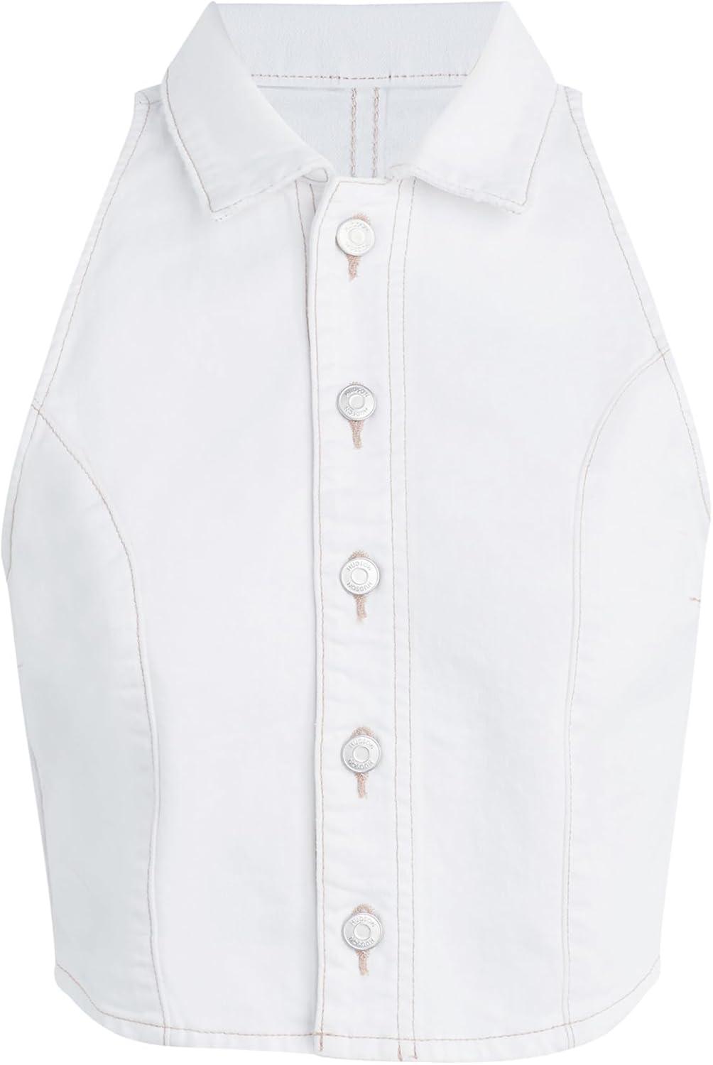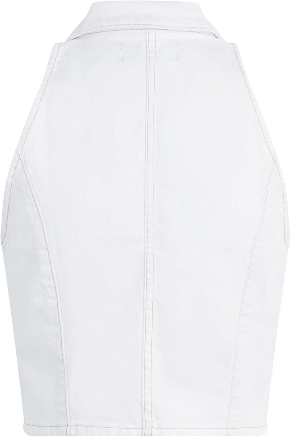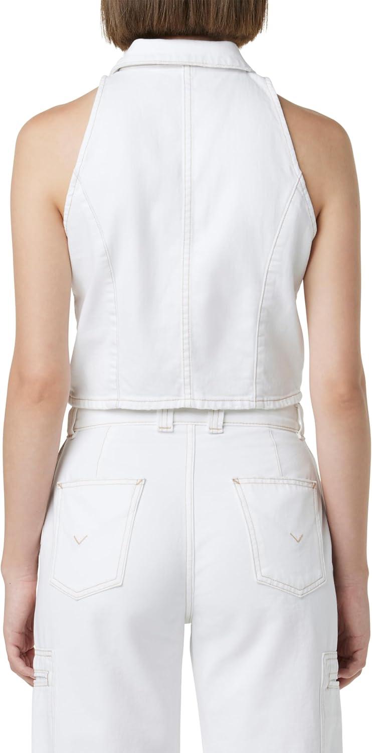 Our Halter Vest in White is a standout vest cut from premium comfort stretch denim with a pointed collar and button up front. Finished with contrast thread detailing.
