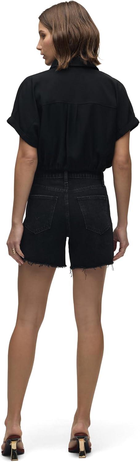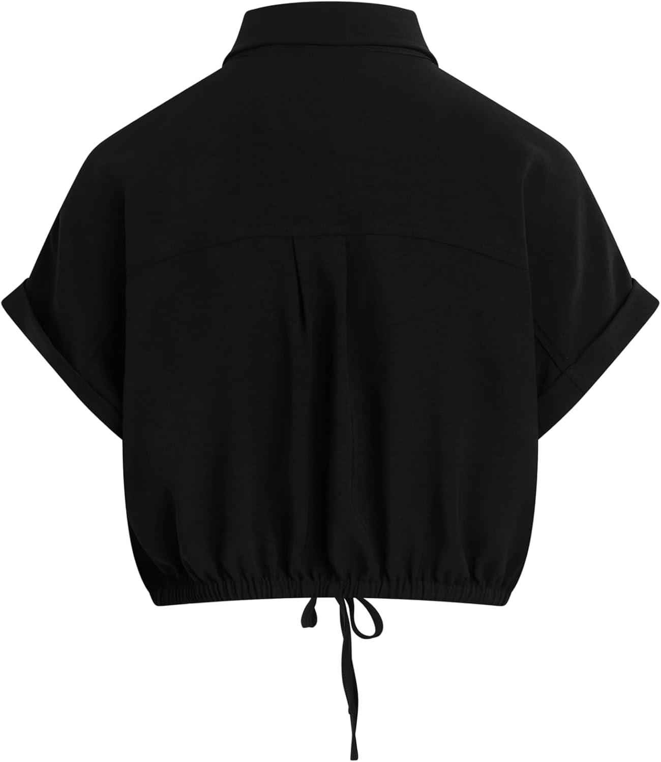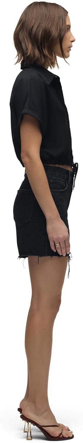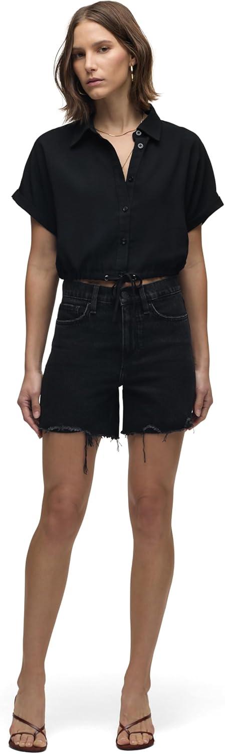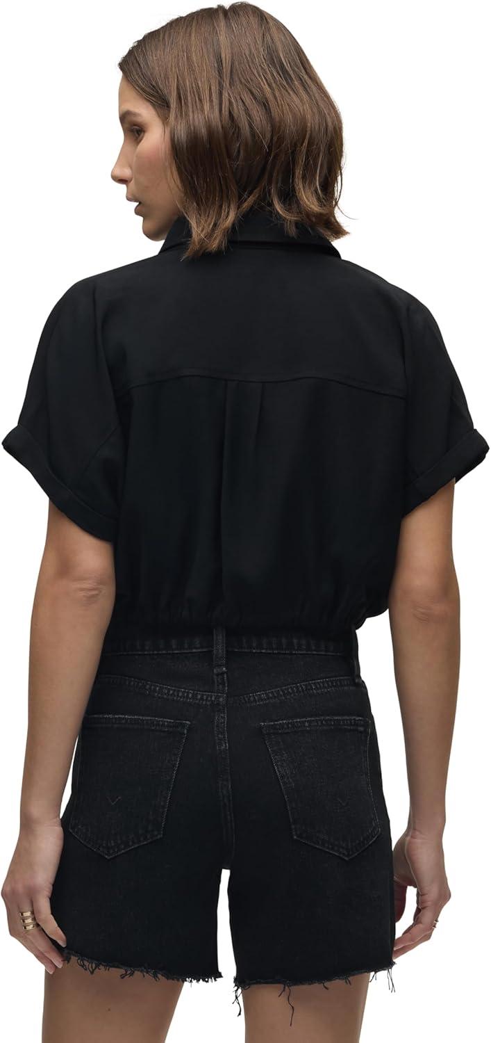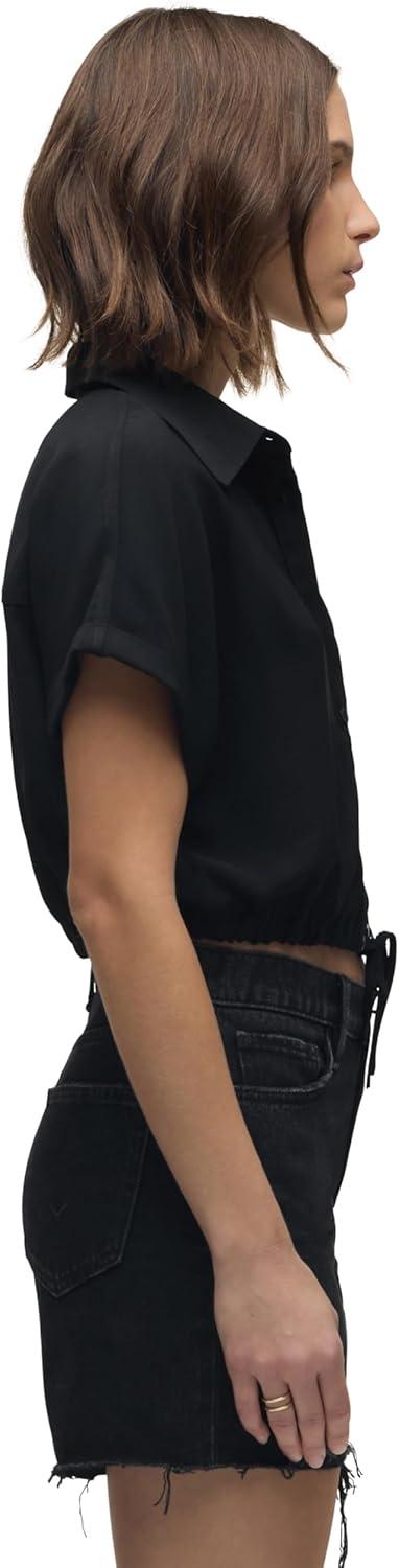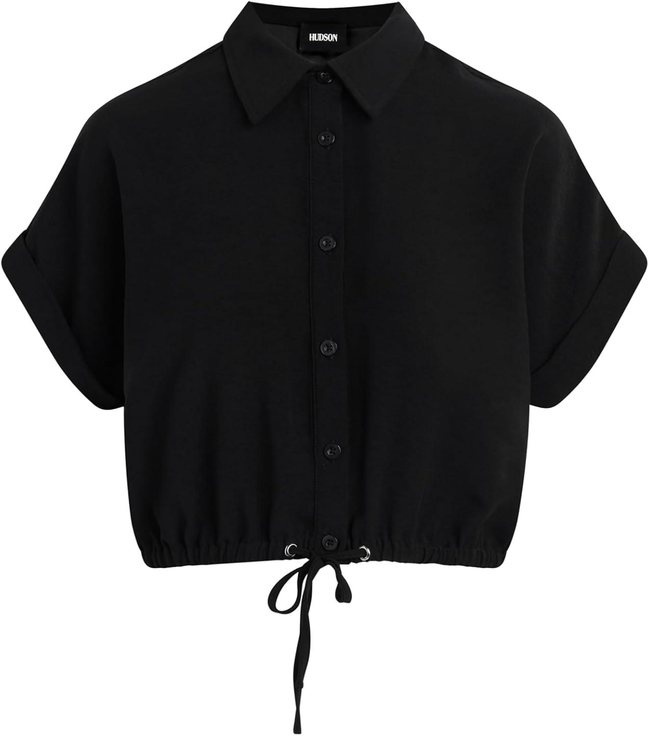 HUDSON womens Drawstring Button Down Short Sleeve Shirt(Black)