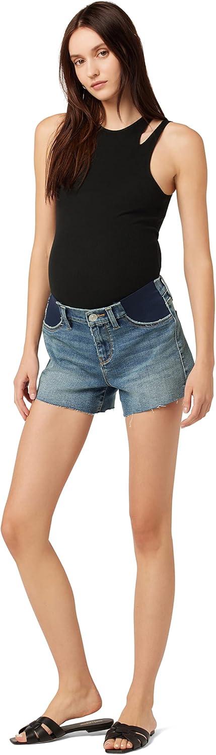 Designed with elastic panels for added comfort and support, our Gemma Maternity Mid-Rise Short in medium indigo Seasons is a mid-rise, relaxed-fit pair crafted from premium stretch denim with a cutoff hem and classic five-pocket details.