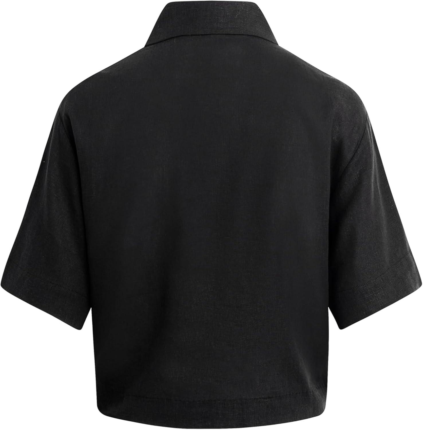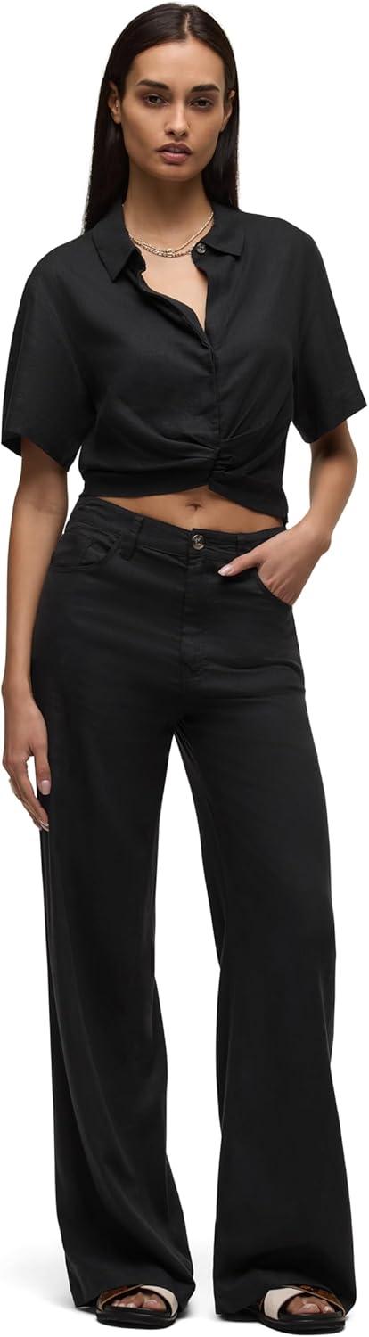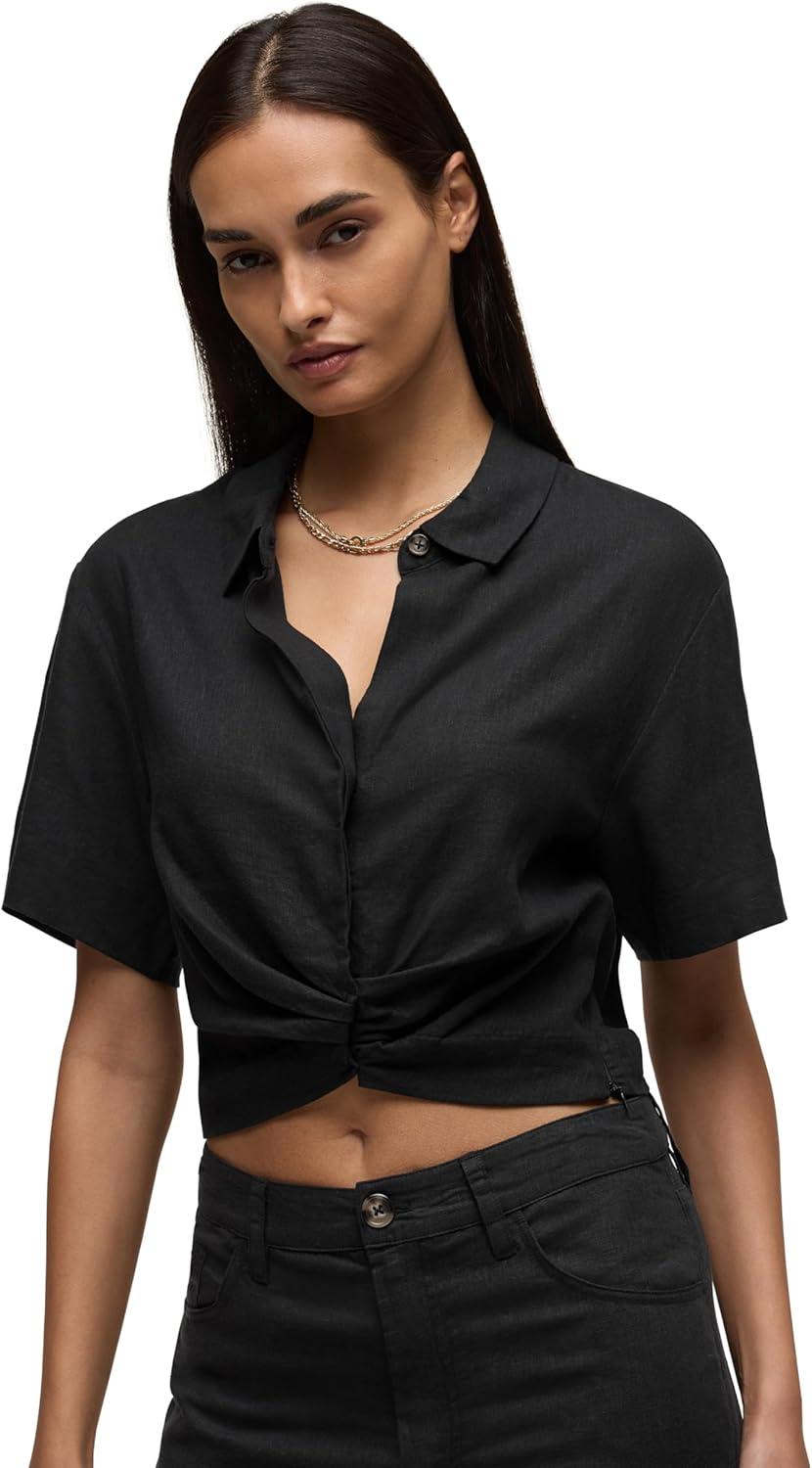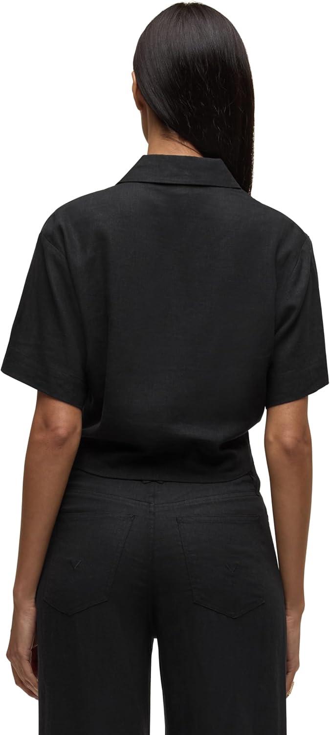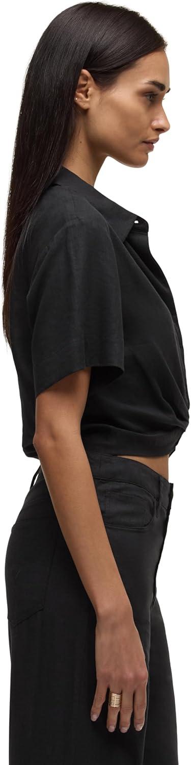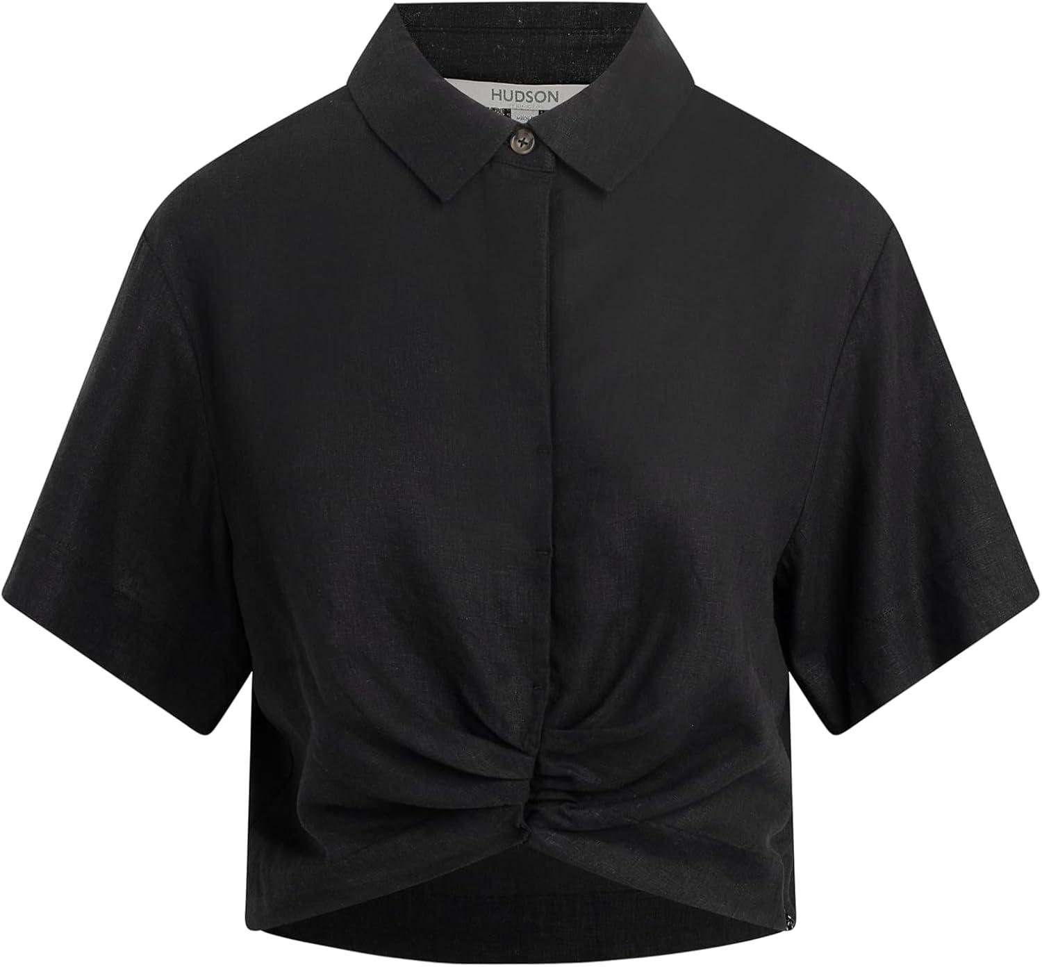 HUDSON Women’s Knot Front Button Down Short Sleeve Shirt(Solid Black)