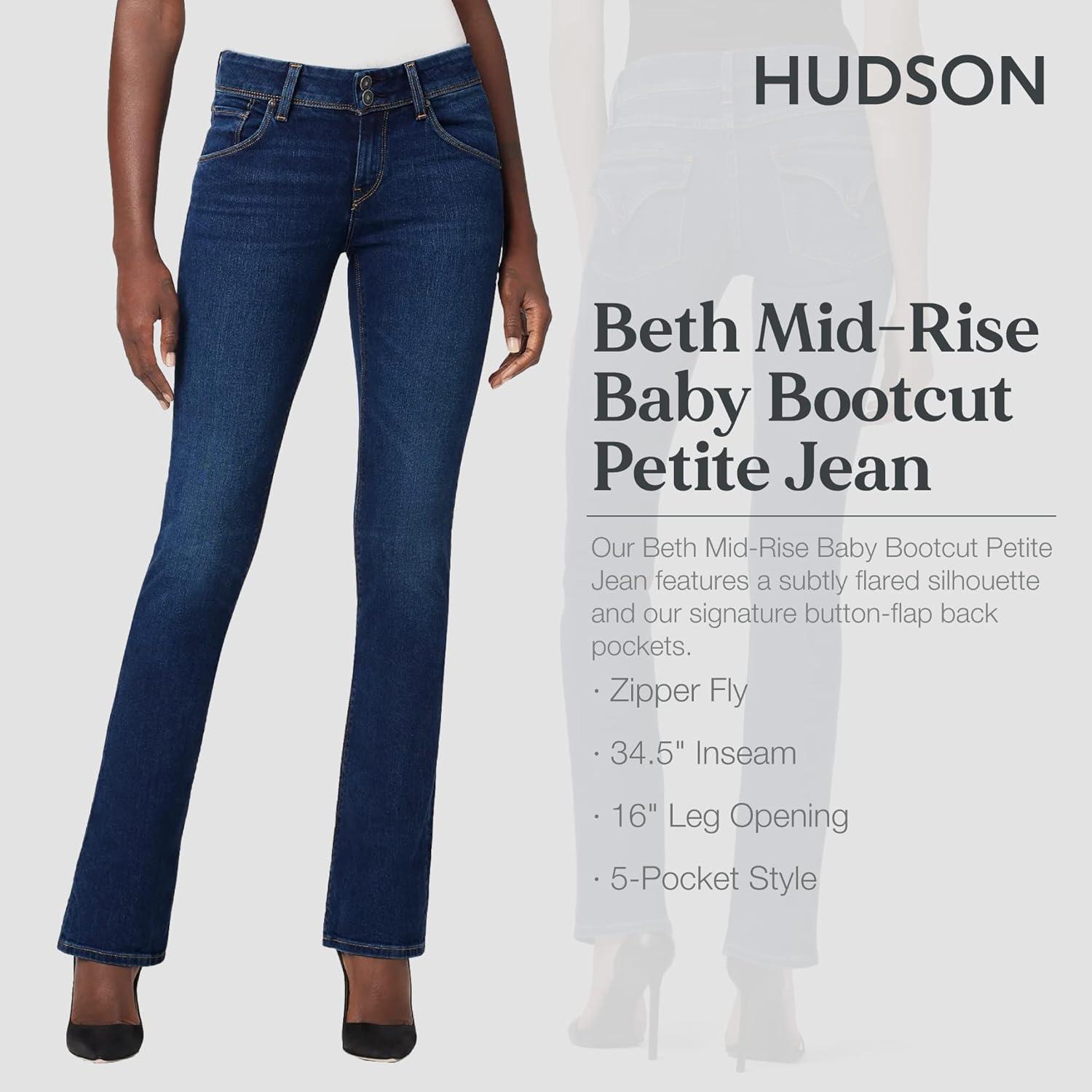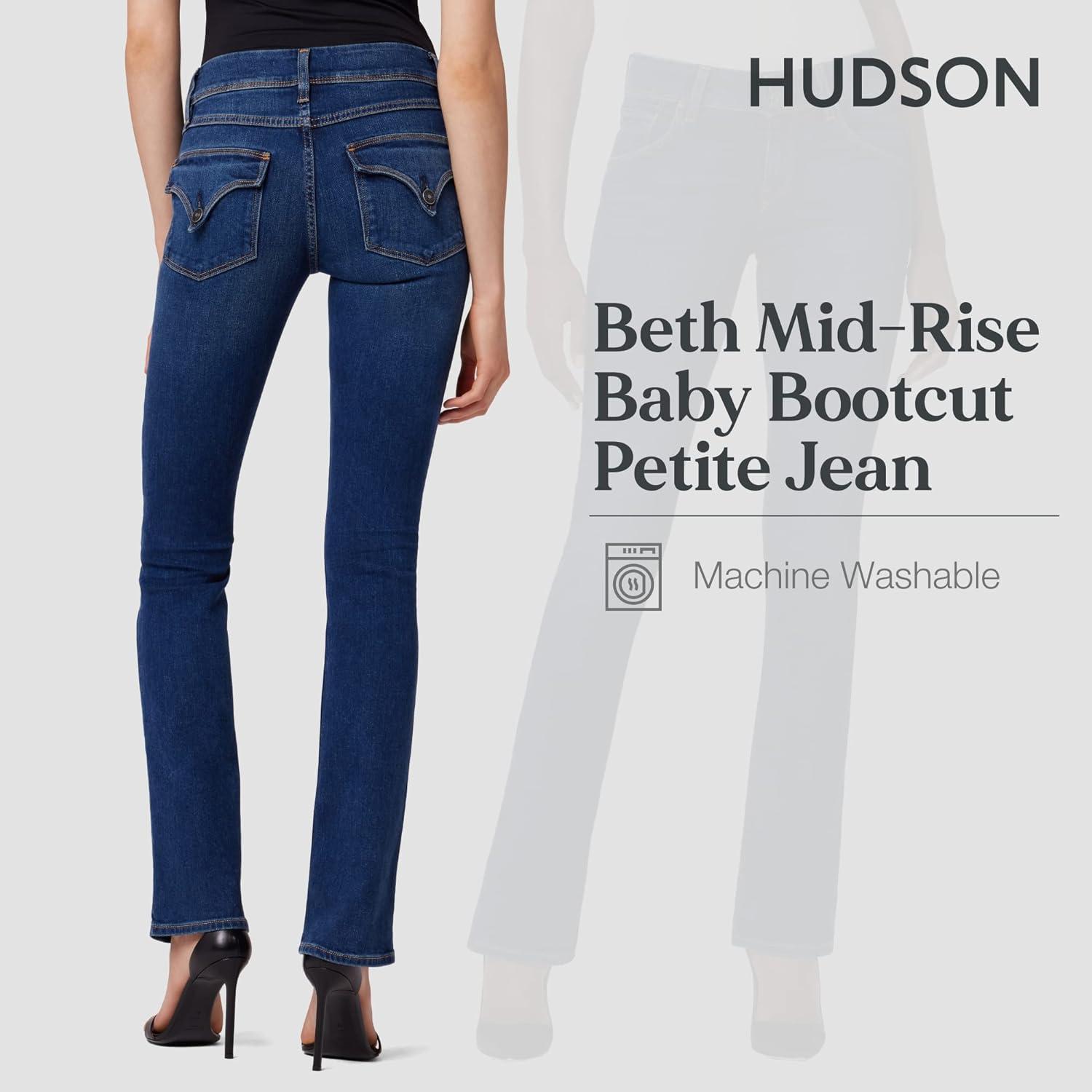 These petite high-rise jeans have a slim, contoured fit, gently flared leg, zipper fly, button closure, and belt-loop waistband. The 5-pocket construction adds function and style wherever you wear them. The high-rise waist measures 8 1/4″ and pairs with the fitted cut, 16-inch flared leg opening, and 31-inch inseam for a modern, flattering profile. Available in multiple washes and sizes, these pants offer an attractive design with unique detailing. Made from a high-quality blend of cotton and elastane for optimum stretch and comfort, these jeans are machine washable on a gentle cycle.